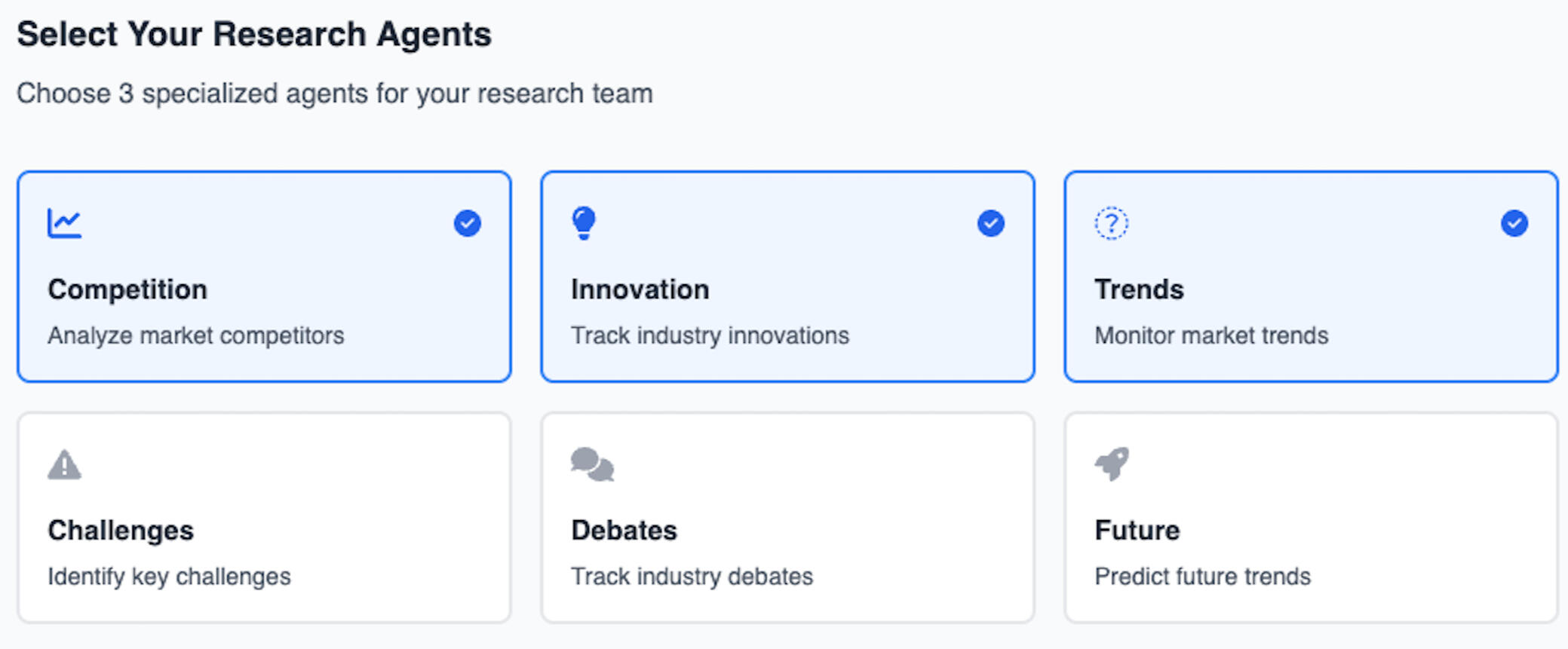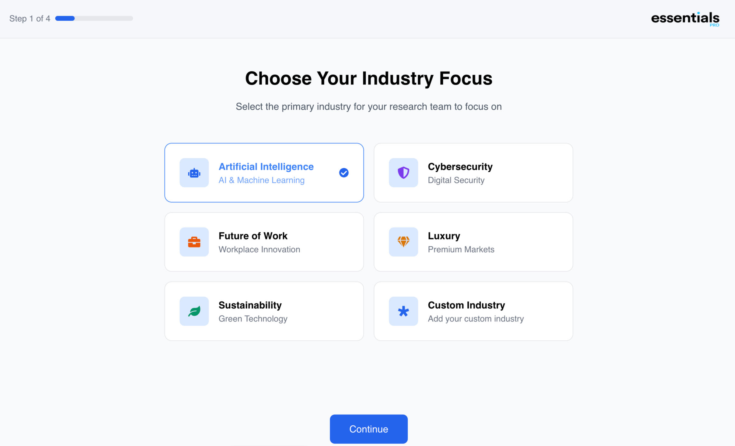 Essentials AI Tracks developments in your industry so you don’t have to.Our agents are pre-configured for competitive analysis & finding latest trends in your industry.Ready to work, use our agents, without any prompting.Once online, your research team will report on a daily or weekly basis about the innovations, challenges, competitors and issues affecting your industry.