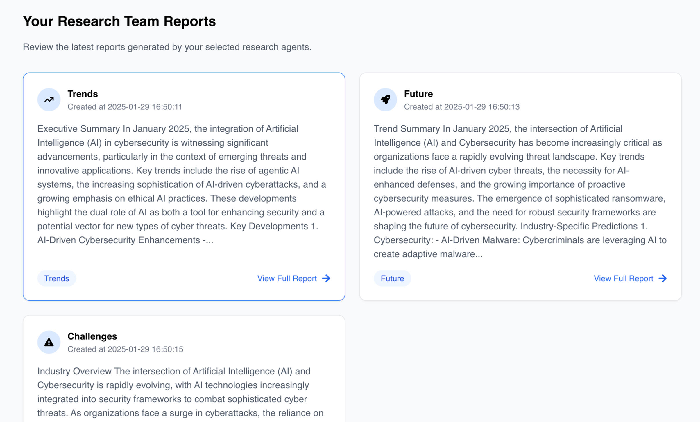 Our multiple agents will give you diverse view points by tapping and reporting on different trusted sources ecosystems. All together they connect business leaders to all moving parts of their industry and market.