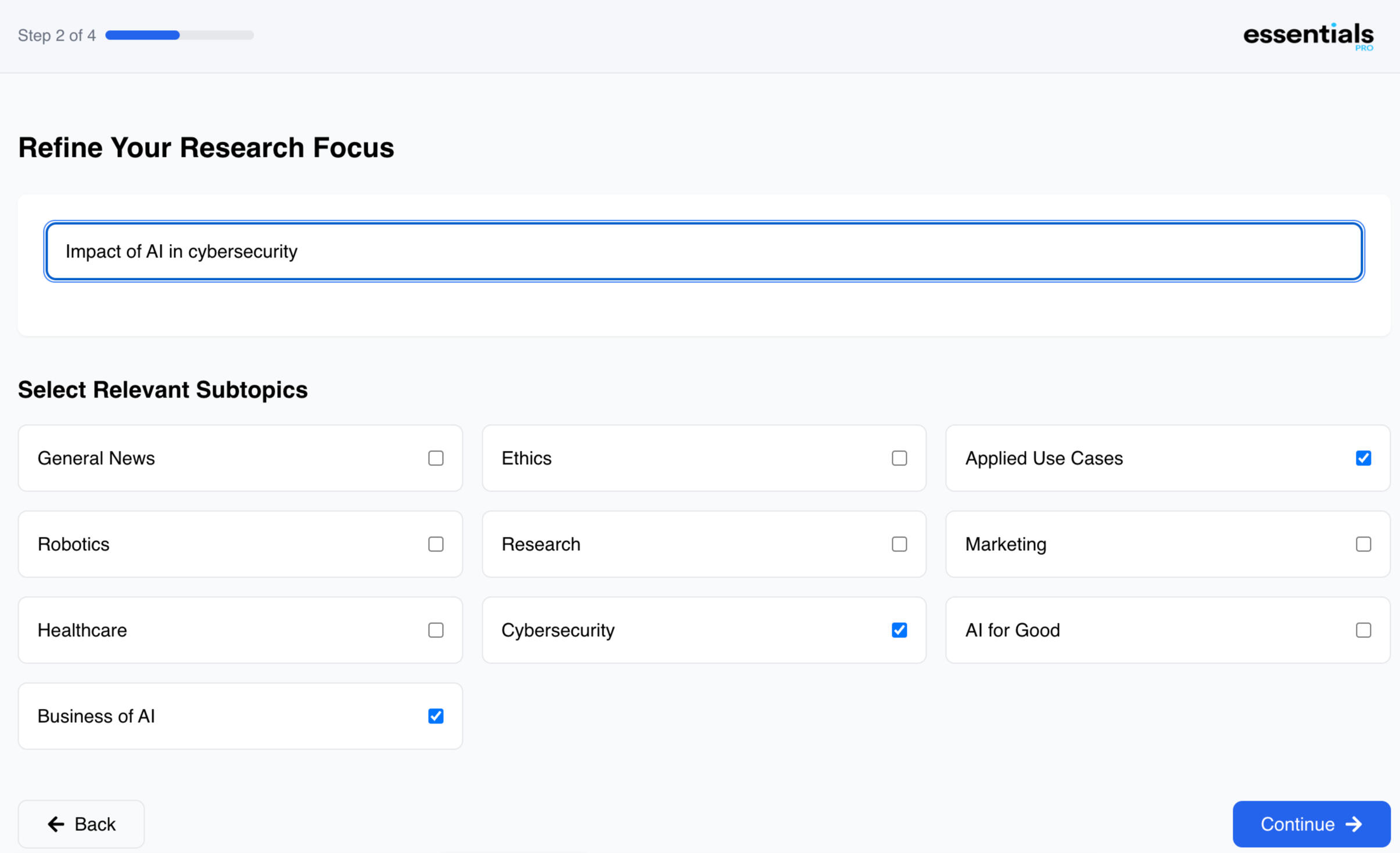 Generalist AI tend to surface "common" content and to state the obvious. Getting these LLM's to dig deeper requires both an advanced structure for prompting and also quite a lot of organisation to keep track of all the searches. With Essentials AI, you get multiple Research Agents already pre-configured to tap into specific specialised sources.